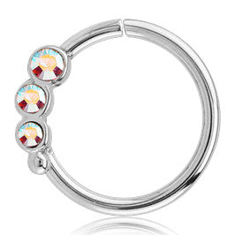 The 16 gauge triple cz continuous ring is made from 316L stainless steel. Also called seamless rings, there's a small gap between the two flat-cut ends of the ring. If you're unsure how to open and close continuous rings (a.k.a. seamless), be sure to check out our video demonstration. Choose your side and gem color below.