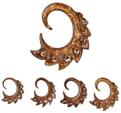Natural materials like horn, bone, wood, and shell will include minor variations in colors and pattern. We guarantee all jewelry will be made from the correct materials as advertised, but it cannot be expected to exactly match the photographs on our website. Hand carved and natural materials will never yield two pieces of jewelry that are exactly the same. Minor variances in the shape and sizing (+/-0.5mm) are considered normal for hand carved body jewelry. We do our best to match two pieces that are most alike when you purchase a pair of earrings. Organic body jewelry should not be used for initial piercing jewelry or freshly stretched piercings. It's generally more fragile than other materials and may require some maintenance for an extended lifespan. It cannot be sterilized with alcohol or chemicals.