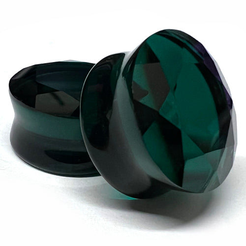 These double flare faceted plugs are made from transparent teal glass. They have a wearable area of 3/8" between flares. Choose your size below.