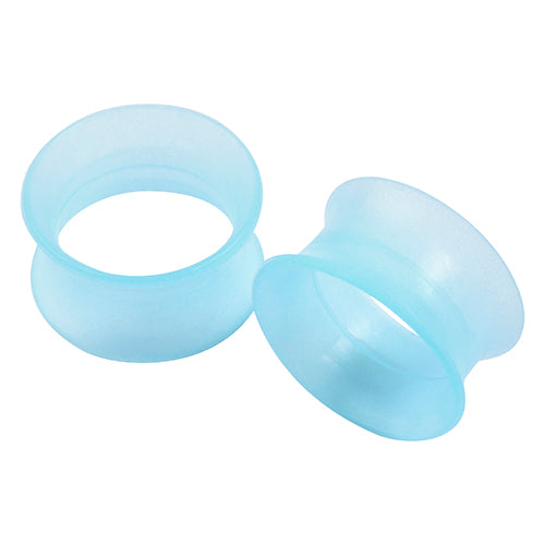 These double flare thin-wall tunnels are made from glow-in-the-dark silicone. They have a wearable area of 5/16" between flares. The material is soft and squishy, very comfortable to wear. The daytime color is light blue as shown in the photo gallery. Choose your size below.