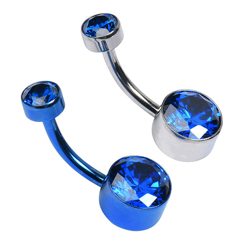 The 14 gauge double cz belly ring is made from high polish grade 23 titanium (Ti 6Al-4V ELI ASTM F136) with external threading. The 5mm top cz disc is removable and the 8mm bottom is fixed. These cannot be returned or exchanged if you select a custom anodized barbell color. Only the high polish (plain silver) is eligible for our return policy. Choose your cz and barbell colors below.