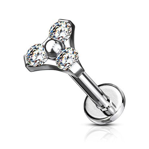 The 16 gauge cz trinity labret is made from high polish grade 23 titanium (Ti 6Al-4V ELI ASTM F136) with internal threading. Only the trinity top is removable. Choose your cz color below.