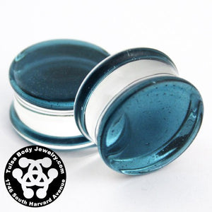 These double flare translucent sparkle blue color front plugs are made from hand blown borosilicate glass by glasswear studios. They have a wearable area of approximately 3/8" between flares. Choose your size below.