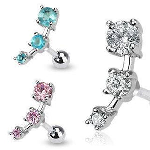 The 16 gauge triple cz droplet cartilage barbell is made from externally threaded 316L stainless steel. Only the ball end is removable. Choose your gem color below.