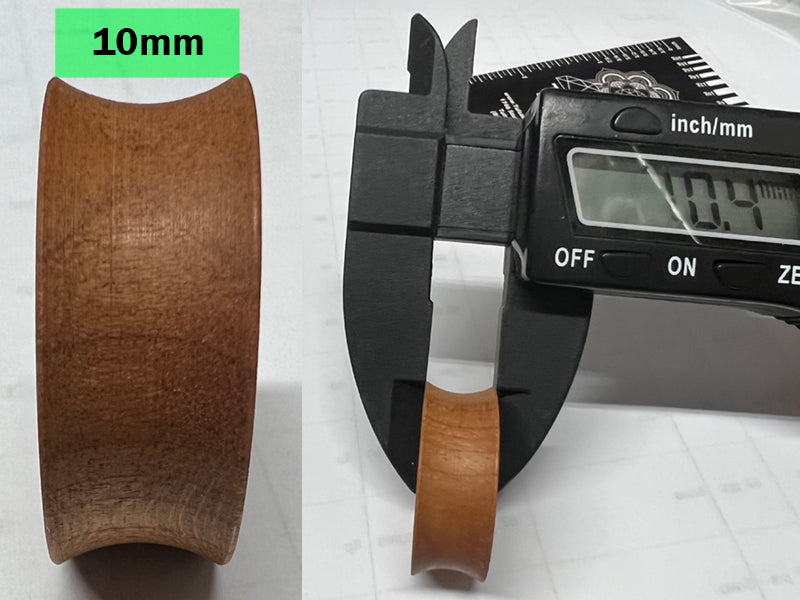 These double flare plugs are carved from walnut wood and polished to a smooth finish. Both sides are flat. Our photo shows the 26mm size. These are available with an 8mm or 10mm wearable area. Choose your size below.