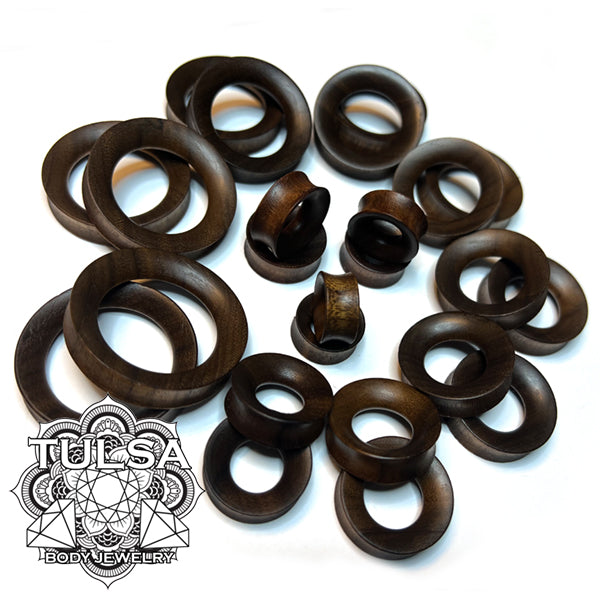 These double flare concave tunnels are carved from walnut wood and polished to a smooth finish. Our photo shows the 26mm size. These are available with an 8mm or 10mm wearable area. Choose your size below.