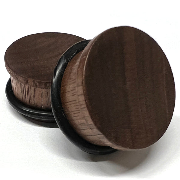 These single flare concave plugs are carved from walnut wood and polished to a smooth finish. They have a wearable area of 8mm between the flare and o-ring. Each one has a groove to secure the o-ring in its place. Our photo shows the 25mm size. Choose your size below.