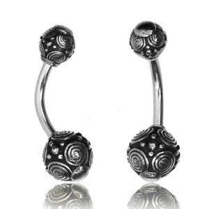 The 14 gauge bali swirl belly ring is made from white brass and 316L stainless steel with external threading. The 6mm top ball is removable and the 8mm bottom ball is fixed.