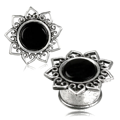 These double flare onyx bali heart plugs are made from white brass. They have a wearable area of 5/16" between flares. Choose your size below.