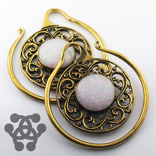 These celtic hoop ear weights are cast from solid yellow brass with synthetic white opal cabochons by Oracle Body Jewelry. They fit stretched ear lobes sized 8 gauge or larger.