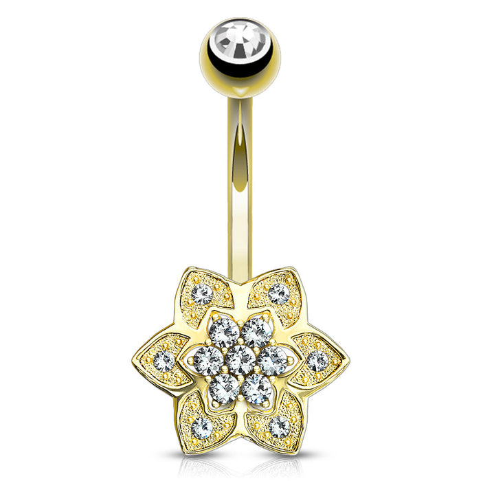 6-Petal CZ Yellow 14k Gold Belly Barbell Belly No-Dangles 14 gauge - 3/8" long (10mm) Clear CZ