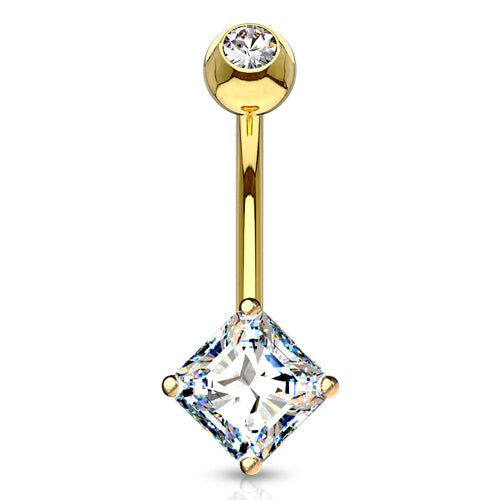 Square CZ Yellow 14k Gold Belly Barbell Belly No-Dangles 14 gauge - 3/8" long (10mm) Clear CZ