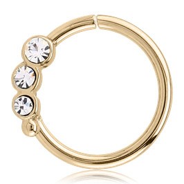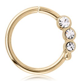The 16 gauge triple cz continuous ring is made from zircon gold PVD coated 316L stainless steel. Also called seamless rings, there's a small gap between the two flat-cut ends of the ring. The cz gems are available in clear only. If you're unsure how to open and close continuous rings (a.k.a. seamless), be sure to check out our video demonstration.